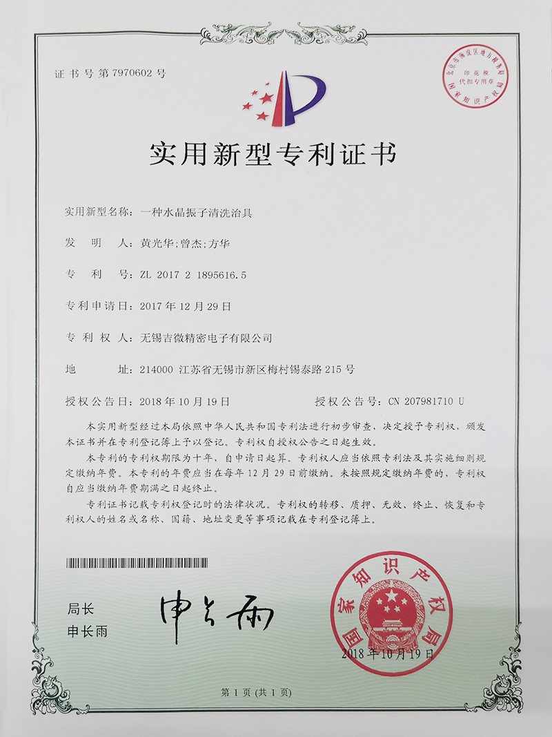 一種水晶振子清洗冶具實用新型專利證書